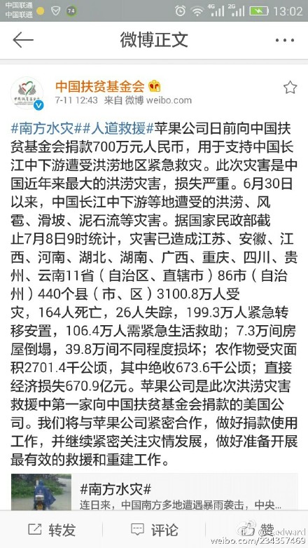有意思的是,就在網(wǎng)友逼捐的同時(shí),中國扶貧基金會(huì)今日中午宣布,蘋果公司于日前向中國扶貧基金會(huì)捐款700萬元人民幣,用于支持中國長江中下游遭受洪澇地區(qū)緊急救災(zāi)。
